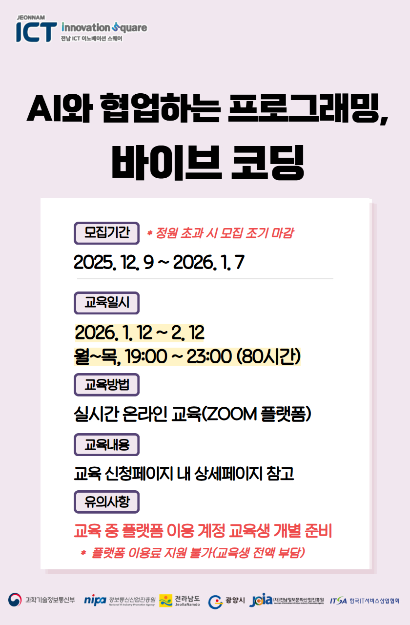 • 생성형 AI 및 노코드/로우코드 도구에 관심 있는 일반인 • 커서 AI와 프롬프트 코딩에 입문하고 싶은 개발자 • 1인 스타트업 및 사이드 프로젝트를 기획 중인 실무자 • 생성형 AI 기반 개발 트렌드를 빠르게 습득하고 싶은 기획자