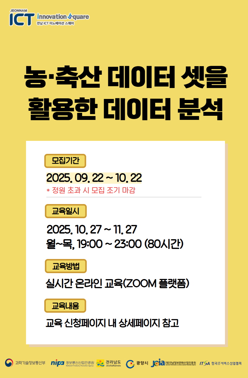 • 파이썬 프로그래밍 입문자 • 파이썬 데이터 분석 및 처리 관련 분야 종사자 및 학생 • 농축산 분야 데이터 셋을 통해 데이터 분석을 하고 싶은 분 • 데이터 수집, 전처리, 분석, 모델링, 시각화 등의 전반적인 데이터 처리 기술을 습득하고 싶으신 분